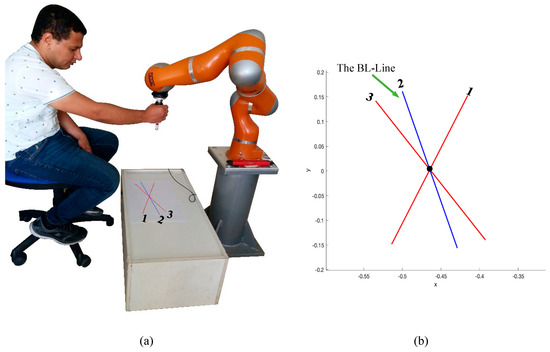 As shown in Figure 10, the blue line (line 2) presents the direction where the human operator guides the robot handle with the task-based condition number index given by the proposed method as the best location-line (BL-line). During the experiment, the human operator is asked for moving the robot handle along this line (BL-line) and along other two random straight lines (line 1 and line 3, red color in Figure 10). The coordinates of the endpoints of the considered three straight-line segments are presented in Table 2. A laser pointer is attached to the handle to project the robot position to the table, where the initial point (the midpoint of the lines) as well as the targets’ points (the endpoints of the lines) are marked visually for assisting the human operator with visual feedback. For ease, the human operator is asked to begin the task from the centers of the lines (black point in Figure 10b) and travel back and forth to the endpoints of the line and then stop at the center point.
