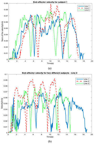 As we stated previously in Section 5, Figure 11 presents the actual velocity of the robot end-effector obtained from two subjects only, out of fifteen subjects, during the movement along lines 1, 2 (BL-line), and 3. This movement tends to approximate the minimum jerk trajectory profile. To prove this concept, the actual velocity of the robot end-effector shown in Figure 11 is compared with the reference velocity of the minimum jerk trajectory. For this comparison, e.g., the first loop of the movement (starting from the initial position to the first endpoint of the line) along each line (1, 2, 3), from Figure 11, is used for a comparison with the minimum jerk trajectory velocity profile. This comparison between both velocities’ profiles is presented in Figure A1.
