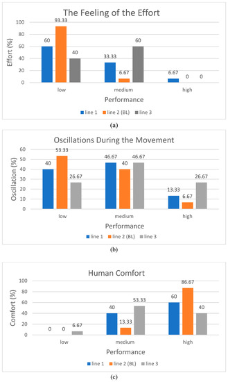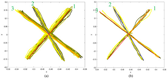 As shown in Figure A1, even if the tendency of the robot’s actual velocity is to follow the minimum jerk trajectory profile, high error appears between both of the two velocities compared to the results obtained from the variable admittance controller (VAC) presented in [53,54]. The constant admittance controller is chosen in our work for simplicity, and it is the reason for such a discrepancy, which does not affect the calculation of the proposed measure. From Figure A1, it is also clear that the approximation between both two velocities is better along line 2 (BL-line) compared with the other two straight-line segments. In addition, the results obtained along line 2 are smoother and with less oscillations. This means that the achieved accuracy along line 2 (BL-line) is the best. From the figure, the worst case occurs with line 1.