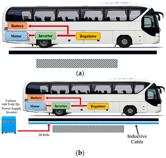 Recently, a new generation of electric vehicles based on wireless charging (WC) technology has been developed to address the problems of current generation systems [10,11,12]. Figure 1 illustrates a Wireless Charging Electric Transit Bus (WCETB) system which is designed based on the wireless power infrastructure equipped with road chargers. In fact, by employing this innovative solution, energy from the network will be transmitted to the vehicle during its movement. The WCETB technology is made of two separate sections: a fleet of vehicles and the charging infrastructure (power transmitters under the road surface) [5,13]. A pickup component is embedded in the structure of WCETB to collect the power from the installed transmitters. The WCETB and traditional electric vehicles have similar concepts where an electric motor and battery pack are adopted as the main engine and energy supply, respectively. However, the WCETB system does not need a cable for connecting the vehicle and charger; the battery in such systems can be wirelessly charged by the transmitters. The power transmitter works based on the idea of noncontact charging which produces a magnetic field to supply the required energy for the vehicle. The inverter and inductive cables are the main components of the power transmitter, which should be installed along the path [5,14].