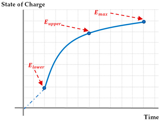 - The energy stored in the battery at time is denoted by . The maximum possible allowed battery capacity is shown by ; and denote the upper and lower battery capacities, respectively (see Figure 3). The mentioned terms should satisfy the following relationships:where terms of α and β are constant with the following definitions: , and .