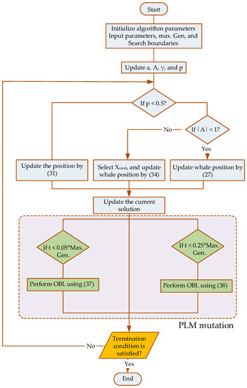 The flowchart of the IWOA is elaborated in Figure 4 [31].