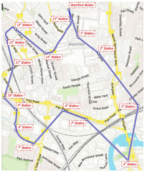 A numerical test network along with the real data are considered to appraise the suitability of the suggested optimization scheme for the WCETB system. Note that all the cases are run on a desktop PC with a 64-bit Windows operating system, an Intel Core i7 @ 3.3 GHz processor, and 8 GB of RAM. Figure 5, and Table 1 illustrate the road information of the WCETB system that operates in Wakefield, located in the United Kingdom (UK). As shown in Figure 5, 16 bus stations (start/end station to the 15th station) are considered on the road map. The profile of the route’s velocity and road gradient is the main feature of the studied WCETB system, which is depicted in Figure 6.