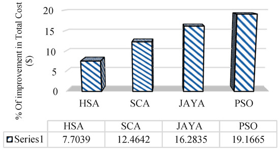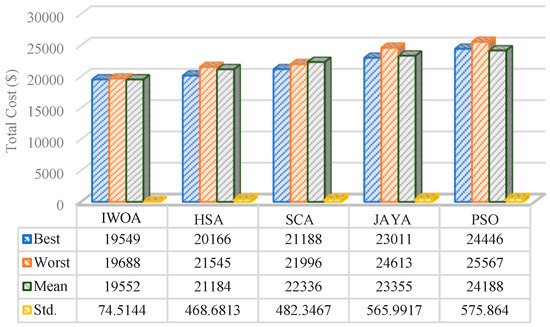 The quantitative comparison of the total cost with various meta-heuristic methodologies.