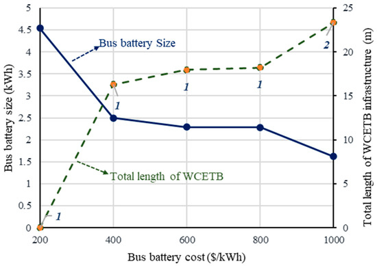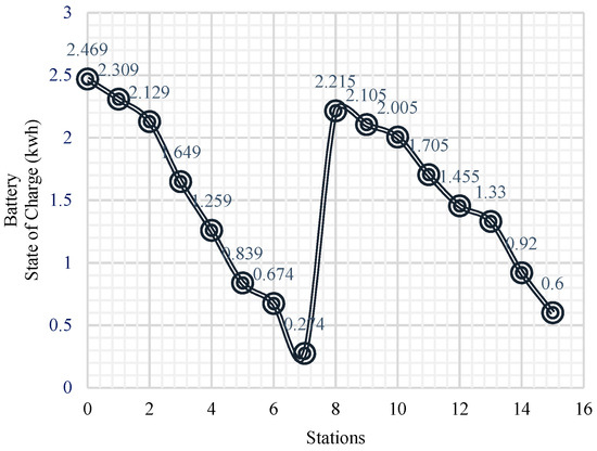 In this stage, the length between stations is increased to 15 times that in the previous case to evaluate the suitability of the suggested optimization approach for long routes. The corresponding results according to this scenario are shown in Table 8. When the length of the route is enhanced, six power transmitters (S3, S4, S5, S10, S12, and S14) are required to supply the vehicle for the entire route, while the vehicle should be equipped with a bigger battery (E0 = 17.156) than in normal conditions. Figure 13 illustrates the battery state of charge for various stations, while Figure 14a,b demonstrate the results for various battery sizes and variations in WCETB infrastructure.