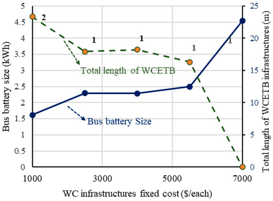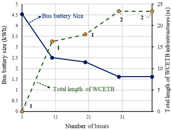 Since the wireless transmitter provides the possibility for the motor to obtain energy wirelessly during the operation of the vehicle on the road, the bus system does not need to be in idle mode for recharging the storage system. As an ideal consequence, the WCETB system will move without the need for any bulky battery [25]. However, the initial investment of the WCETB system due to the utilization of the power transmitters is higher than that of the plug-in electric vehicle system. In the long run, the deployment of the WCETB system is more cost-effective, i.e., the battery’s size is reduced, and the operating time is enhanced by eliminating the time that would be dedicated to recharging. Moreover, the costs of the battery system and the transmitters include the major portion of the entire cost of the WCETB [17].