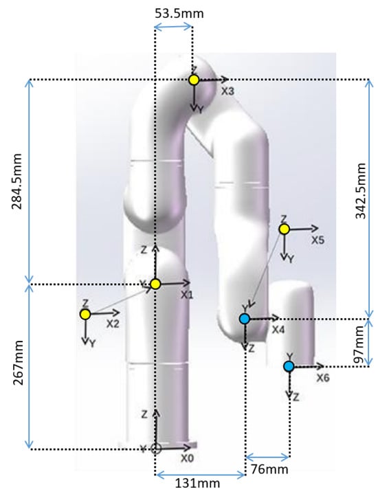 For the kinematic analysis, modified Denavit–Hartenberg (DH) parameters are used, whereas the iterative Newton–Euler approach is used for the dynamic analysis. Figure 3 shows the link-frame attachment for the modified DH parameters of the xArm6 robot, where the yellow circles indicate the direction heading into the viewing surface, the blue dot indicates the direction facing outwards from the surface, and the z-axis determines the rotation axis of each joint.
