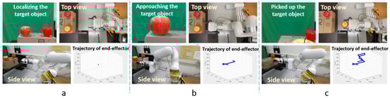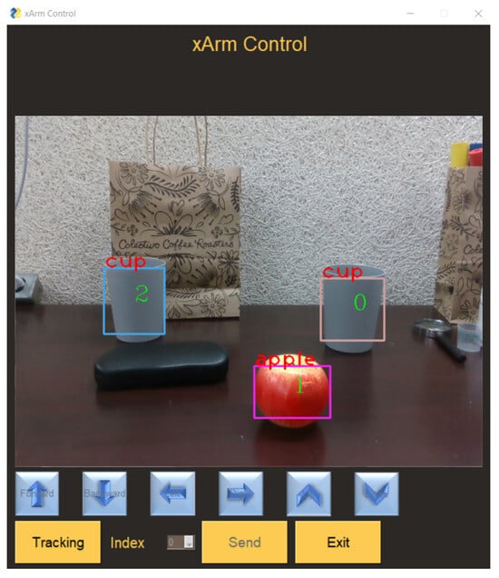 If the object pick-up/tracking mode is disabled, the RGB frame, along with the object labels and bounding boxes for each object in the frame, is displayed to the user. Users can manipulate the robot’s end-effector in any direction using the movement commands. Likewise, if the object pick-up/tracking mode is enabled, the system freezes the screen and annotates various objects before displaying the freeze frame to the user. It also stores the current location of the end-effector as the safe location to move back here after grabbing the target object. Additionally, the system assigns an index number to each object on the frame. Then, it asks the user which object should be picked up and takes the object’s index number as input. Based on the user’s input, the system then computes the 2D coordinate of the center point of the target object with respect to the depth camera. Utilizing the depth channel of the camera, the system estimates the distance between the camera and the center point of the target object and uses this as the third coordinate for 3D localization of the target object. Using the mapping equation (Equation (5)), it converts the coordinates from pixel values to robot Cartesian coordinates, where a, b, and c are constants and have different values for different axes.