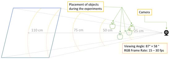 To localize the detected objects in 3D space, we used an Intel RealSense Depth D435 camera [45]. The camera captures depth information in addition to color, which allows us to calculate the 3D position of objects in the scene. The Intel RealSense Depth (D435) camera works as a depth camera, using a combination of several sensors and algorithms [46]. The camera contains an RGB sensor, an infrared (IR) projector, an IR camera, and a dedicated depth processing chip (see Figure 2). When the camera operates, the IR projector emits a pattern of IR dots into the scene. The pattern of dots is designed to cover the entire scene and is structured in a way that allows the depth processing chip to calculate the depth of each pixel in the scene.