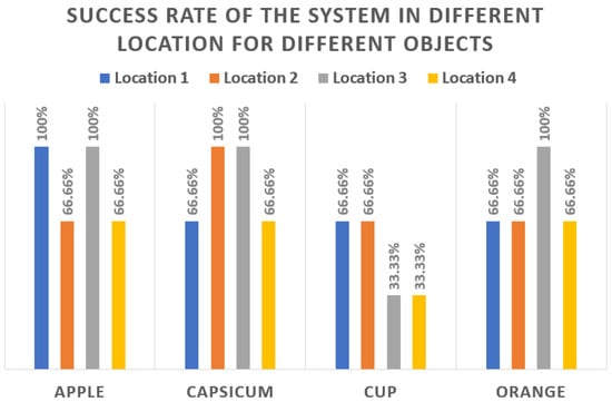 After computing experiments with various objects, we found that the system could successfully detect and localize different objects, such as apples, oranges, capsicum, bottles, cups, etc., presented in front of the camera. After the detection model detects the ADL objects, the system generates the 3D coordinates in real time. Using this approach, the system can operate at 15–20 frames per second without issues. During the experiment, the depth frame accuracy is estimated as follows: 97.8% at short range (less than 50 cm), 93.4% at medium distance (51–100 cm), and 92.5% at larger distances (100–200 cm). A mean error of 4.8 cm is computed for the depth measurement throughout the experiment.