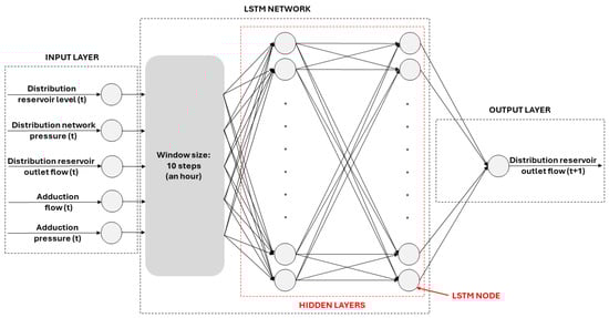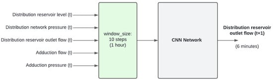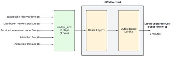 In the present work, ANN of the type LSTM, which is commonly used in time series problems, was chosen for flow prediction due to its ability to retain short-term memories. A very short-term forecast receives as input the delayed values of the five variables in 10 measurements, equivalent to one hour, and returns a prediction at the network output one step ahead of the flow. The model flowchart can be seen in Figure 1.