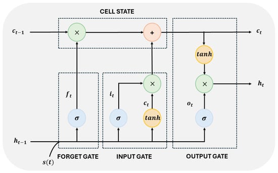 As illustrated in Figure 2, a distinctive feature of LSTM is the existence of three fundamental gates in each node (neuron): the input gate, output gate, and forget gate. In this LSTM cell, and are a hyperbolic tangent and a sigmoid function. The input signal and the previous cell output are concatenated at the forget gate. In brief, the role of the input gate is to insert new information relevant to updating the cell state; the forget gate uses sigmoid function scaling to prevent LSTM networks from processing continuous input streams that are not segmented; finally, the output port determines the hidden state h(t), which makes predictions. The signals and are passed through a sigmoid, producing an output signal . This signal is multiplied by the signal produced after passing the cell state through a hyperbolic tangent function to obtain the next hidden state, [26].