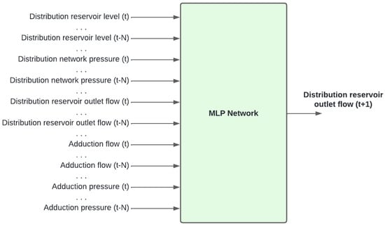 For the studied case, the input layer comprises the five original features and their respective N temporal delays as illustrated in Figure 4. As N equals 5, and each sample is obtained every 6 min, the model’s input encompasses a delay of 30 min. The MLP neural network has two layers with 30 neurons each. The performance of this configuration was considered better after varying the number of MLP layers between 1 and 2, with the number of neurons varying up to 50. Rectified Linear Unit (ReLu) was used as the activation function.