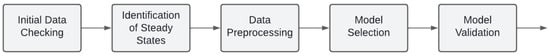 In the present research, the methodology for creating a virtual sensor has the following five main steps [6]: (1) initial data inspection; (2) identification of steady states; (3) data pre-processing; (4) selection of model; and (5) model validation. This process is illustrated in Figure 6.
