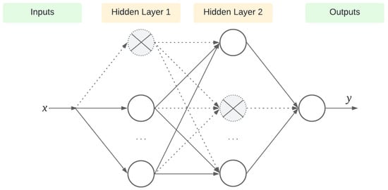 In developing virtual sensors based on artificial neural networks, one approach used to reduce its uncertainty is Monte Carlo dropout, which is based on the concept of dropout used for ANN regularization to reduce overfitting and, hence, make a more general model. The method consists of deactivating, in a random way, neurons in the input layers and hidden layers of the ANN as illustrated in Figure 7.