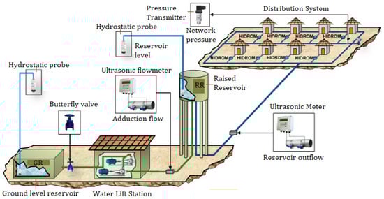 A diagram of the supply system used in this work is illustrated in Figure 8. In the present work, measurements related to level, pressure, and flow were sent to the SCADA (Supervisory Control And Data Acquisition) system from the water supply company. Such measurements were carried out every 30 s, and the record made every 6 min represents the average number of readings in the time interval.