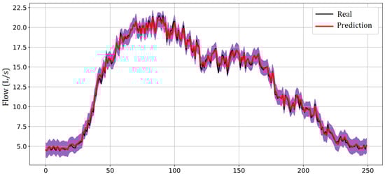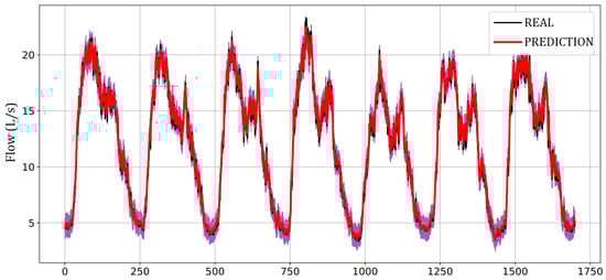 The results can be viewed in the graphical representation in Figure 12 and Figure 13; the curve in black corresponds to the actual water flow, while the black curve represents the flow predicted by the proposed model. The lilac strip, delimited by the two curves, illustrates measurement uncertainty. Through them, it is possible to observe how the neural network, on average, can follow the actual water flow in the system.