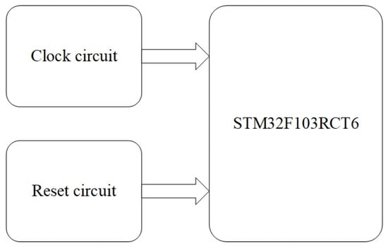 The minimum system of the microcontroller determines whether the system can function properly. This system uses the STM32F103RCT6 microcontroller (STMicroelectronics, Geneva, Switzerland) in an LQFP64 package, supported by clock circuits and a reset circuit to form the processing unit [30]. The STM32F103RCT6 is an integrated circuit (IC) embedded microcontroller with a 32-bit Cortex-M3 core processor, operating at a speed of 72 MHz, with a program memory capacity of 256 KB of FLASH type and a RAM capacity of 48 K [31]. It is known for its high performance and low power consumption. Additionally, it boasts a wealth of peripherals, including general-purpose timers, multiple serial communication interfaces, and analog/digital converters, fully meeting the data acquisition and control requirements of this system [32]. The STM32F103RCT6 forms the core of the processing unit, as illustrated in Figure 1.