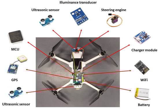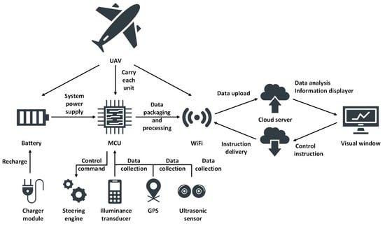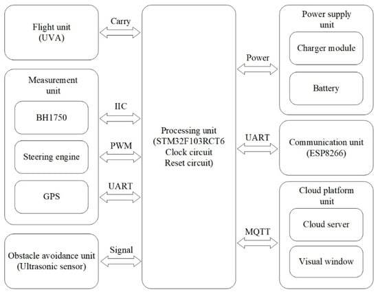 The UAV-based illuminance collection system is comprised of seven main components: the flight unit, processing unit, measurement unit, obstacle avoidance unit, communication unit, power supply unit, and cloud platform unit [27].