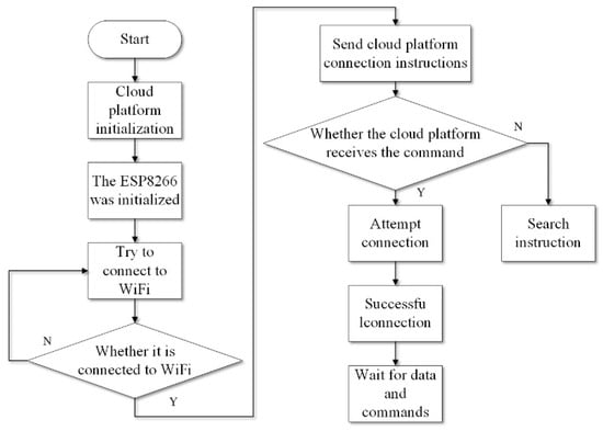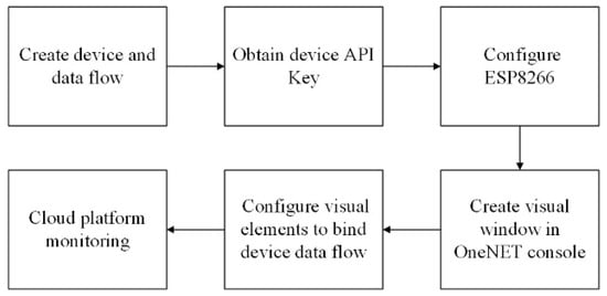 The software design of this system is divided into two main areas: cloud platform development and system program design. Initially, the cloud platform development involves several steps: creating devices and data streams, obtaining the device’s API key, configuring the ESP8266, creating a visualization interface in the OneNET console, configuring visualization elements to bind to the device data streams, and monitoring via the cloud platform [43]. The specific process is illustrated in Figure 4.