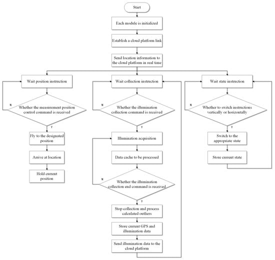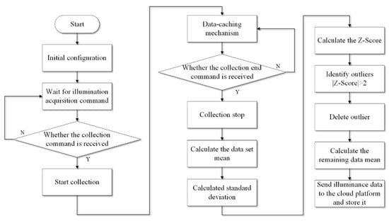 Illuminance collection programming is the core of the system’s software design, involving illuminance data collection, switching between horizontal and vertical illuminance, control of measurement positioning, and sending location information. The detailed programming process flow is shown in Figure 6.