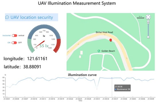 The visualization interface developed on the cloud platform is shown in Figure 10. It features a dashboard and graphs that can display current illuminance data, which can be refreshed every second. An information alert box displays whether the UAV’s position is safe in real time; two buttons control the start and end of illuminance data collection, as well as switch between horizontal and vertical illuminance measurements; a map displays the real-time location of the UAV illuminance measurement system; and the platform also displays latitude and longitude data in real time.