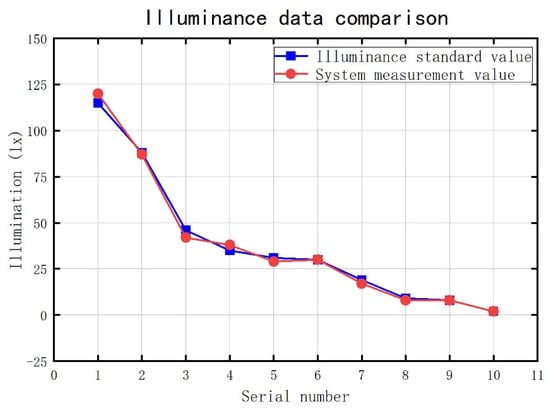 In the process of road illumination acquisition, comparative experiments between our system and traditional manual measurement methods showed high consistency in the measurement results. A traditional manual measurement that requires four people to cooperate for 40 min can be completed by our system in only 8 min with two people, saving 50% of the manpower and 80% of the time, thereby greatly improving on-site measurement efficiency.