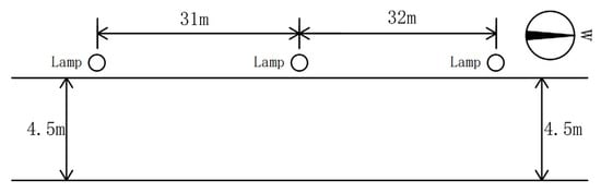 After completing system integration and testing, an experiment was conducted to collect road illuminance data on a selected road in Dalian. This road is a single-lane with single-sided lighting, a lane width of 4.5 m, and streetlights at a height of 3 m. The road runs east–west, with the distance between the first and second streetlights being 31 m, and between the second and third streetlights being 33 m. The lighting layout is illustrated in Figure 13. In this experiment, we used both the UAV-based road illuminance measurement system designed in this study and traditional manual road illuminance measurement methods. To avoid the influence of daylight and other factors, the illuminance data collection was conducted after 9 PM.