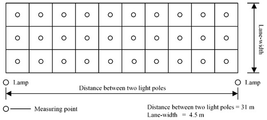 Based on the GB/T 5700-2023 “Illumination Measurement Methods” standard, and taking into account the actual conditions of the road, the area between the first and second lamp posts was selected for measurement. According to the center point method, the measurement area was divided into 30 rectangles, each 3.1 m long and 1.5 m wide, with the center of each rectangle serving as a measurement point, marked with a yellow marker to ensure full coverage between the two lamps. The layout of the measurement points is illustrated in Figure 14.