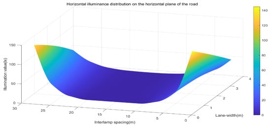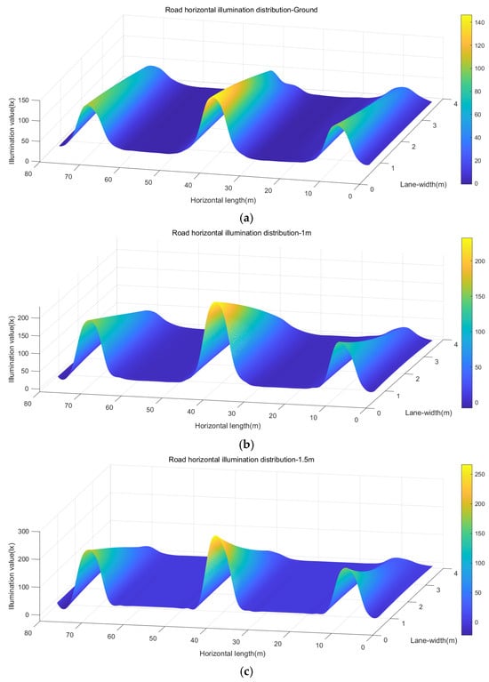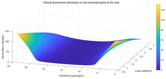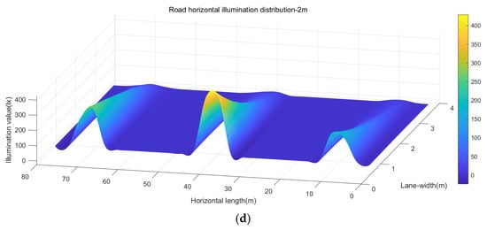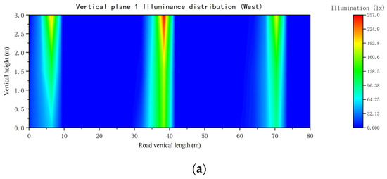 The road illuminance distribution diagram uses road width as the x-axis, the distance between two lamps as the y-axis, and illuminance values as the z-axis, depicting the distribution of road illuminance. The horizontal illuminance distribution diagram reflects the overall illumination on the ground, showing higher illuminance values near the lamps and significantly lower values between them, due to the limited radiation range of the lamps. The vertical illuminance distribution diagram highlights the vertical distribution of lighting, similar to the horizontal distribution, with higher illuminance near street lamps and lower between them [48]. These distribution diagrams provide a more intuitive understanding of spatial changes in road illuminance, offering robust data support for in-depth analysis of road lighting.
