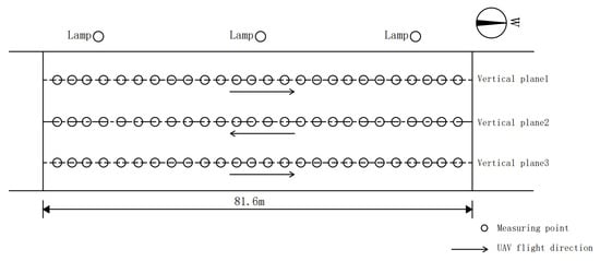 The spatial illuminance distribution in each direction is analyzed below. For the illuminance data at the same height in each direction, the UAV measured point by point following the flight path shown in Figure 17. After completing all the data measurements at one altitude, the UAV proceeded to the next altitude. Figure 20a–c shows the vertical illuminance distribution in the three vertical planes on the south side.