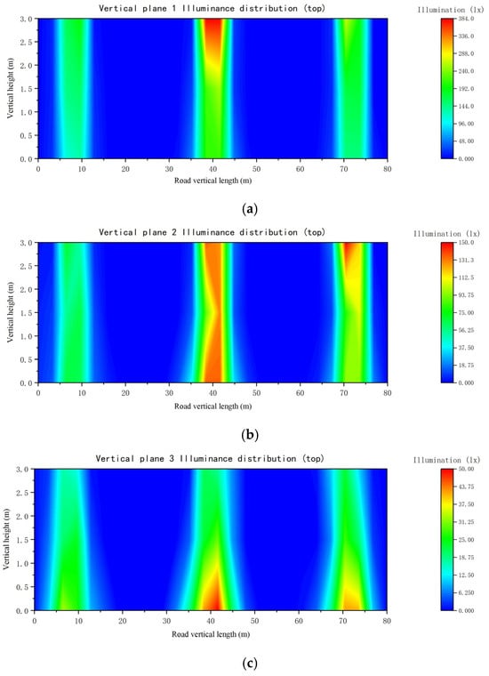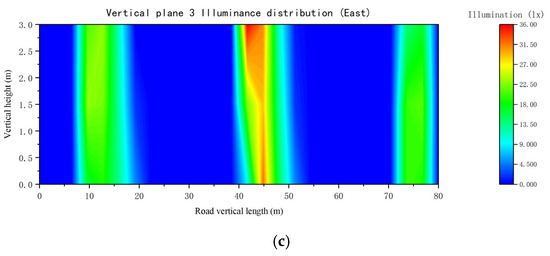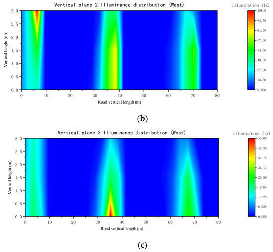 Illuminance distribution on the west side of the vertical plane, showing (a) vertical plane 1, (b) vertical plane 2, and (c) vertical plane 3.