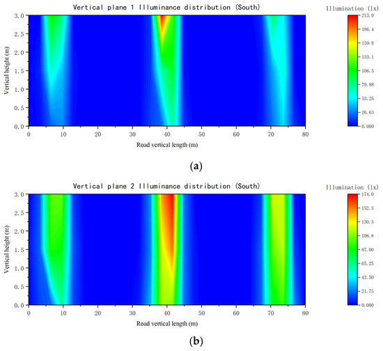 The illuminance distribution on the south side of the vertical plane closely resembles that on the top of the vertical plane, with higher illuminance values observed closer to the fixture. The maximum illuminance (Emax) values for vertical planes 1, 2, and 3 are 213 lx, 174 lx, and 69 lx, respectively. As the distance from the light source increases, the illuminance intensity decreases significantly, but the distribution becomes more uniform.