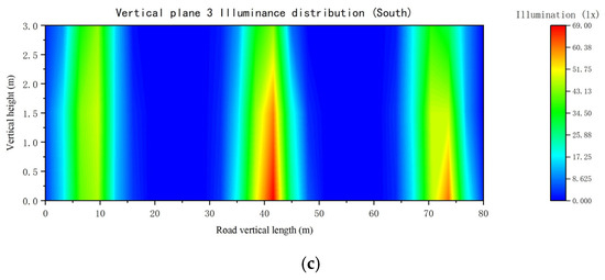 Illuminance distribution on the south side of the vertical plane, showing (a) vertical plane 1, (b) vertical plane 2, and (c) vertical plane 3.