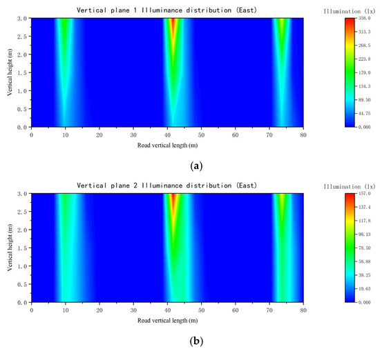 Based on the analysis of the illuminance data on the east and west sides of the vertical plane, it can be concluded that the longitudinal illuminance distribution of the road exhibits a characteristic shift in opposite directions. The uniformity of illuminance deteriorates as the distance between streetlights increases.