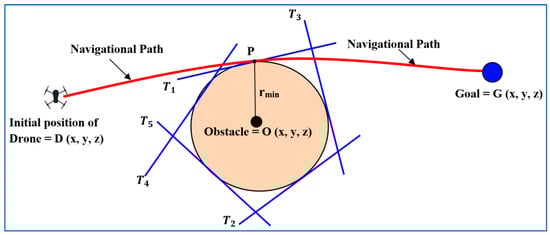 . There is a set of tangents of a sphere. The drone selects these tangents as the navigation path DP. At point P, the drone measures the distance using sensor PG and reaches goal G. The drone follows Equation (1) for this optimal navigation.