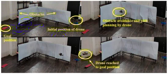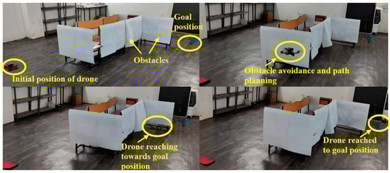 Figure 4a. On the other hand, this system was activated when obstacles were identified, ensuring that the drone’s navigation was effectively and safely planned around them. This demo took place in a small area with obstacles placed to meet certain needs, which effectively highlighted the drone’s versatility in real-world situations. The drone’s navigation path from its original starting point to its intended destination is shown in