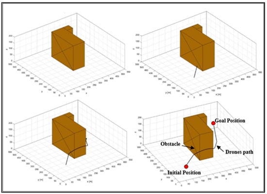 Figure 8 are compared in obstacle-contained environments. The drone’s starting location, the goal position, the number of obstacles, and the obstacle’s position are all similar in the environments taken into consideration for the simulation analysis and the experimental setup. The goal of the analysis is to compare the path’s length and the amount of time needed for navigation when the drone plans its route from the starting point to the destination. It is evident from the results in