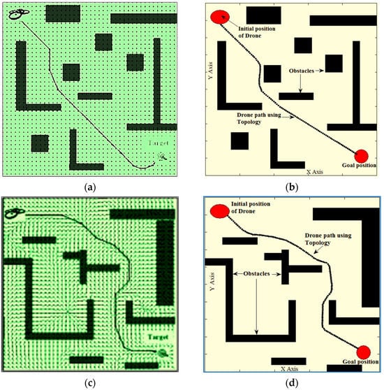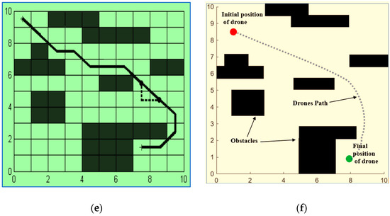 Figure 9b,d, a fresh simulation setup is made with the same environmental parameters as those considered in the cited work to conduct a comparative analysis. This covers elements like the quantity, size, and locations of obstacles in addition to the drone’s starting and finishing places. Similarly, the proposed approach is also compared with Ant Colony Optimization (ACO) [