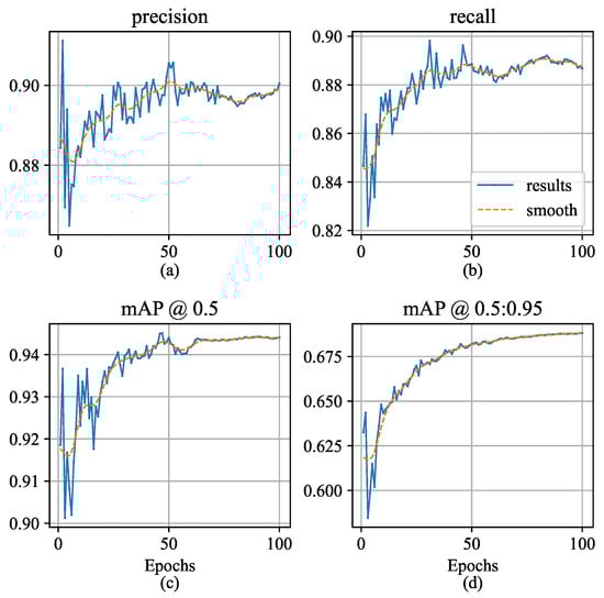 Figure 3 presents the training metrics of the medium model after each training epoch, showing that the mAP@50 reaches a plateau after 65 epochs. P and R are always opposing metrics [65], with increasing P affecting R, as can be seen in Figure 3a,b. Hence, mAP provides a better measure for considering the convergence of the model.