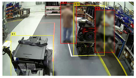 View of floor lines, with power wheelchairs and workers represented by yellow and red boxes, respectively. The people in these images are blurred to protect their identities and comply with the request from the industry partner.