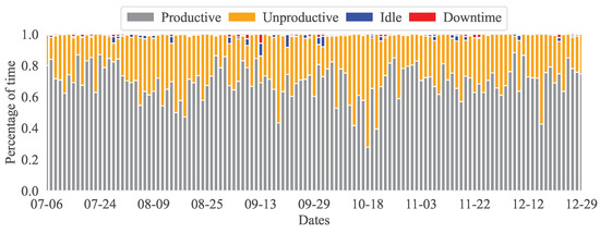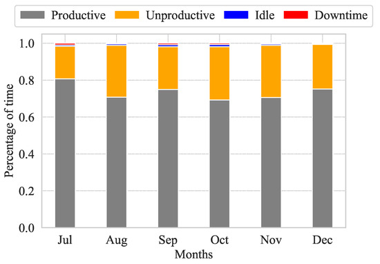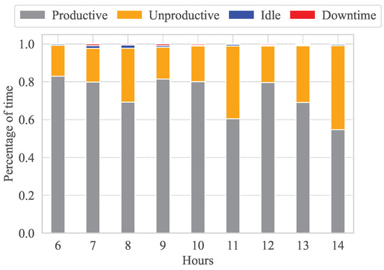 Given these challenges, we propose a non-invasive system for capacity constraint analysis. This system tracks the station and cycle time of chairs, allowing for effective labor and inventory planning. Over six months (July to December), we collected videos from four workstations identified by MES data as a primary bottleneck. For simplicity, we can label them as A, B, C, and D, with Station C being the critical one. As the facility works only for the morning shift, data were collected for 8.5 h daily. We excluded three standard 25 min break times and detected workers and chairs using the trained YOLOv8 model as outlined in Section 3. Each frame’s status was aggregated to extract various metrics. Figure 6 shows that Station C is 27.9% unproductive, indicating a critical labor shortage with a high percentage for the whole duration. Figure 7 reveals a consistent trend in productivity over the months, contrary to the expected increase towards the year’s end due to high demand. This consistency points to a critical labor shortage. Figure 8 depicts normalized hourly productivity data. Notably, productivity is higher in the morning than in the afternoon. Figure 9 represents the daily insights into the client’s capacity constraint. They are productive only for 60% to 65% of the time during the 8.5 h shift, and the remaining time is mostly unproductive when a worker is not available at the station to work on the chair.
