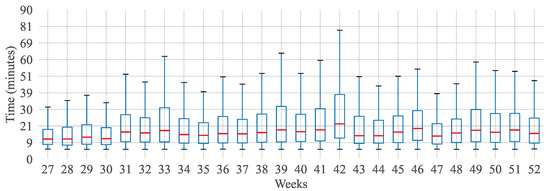 Box plot of the processing time for all the chairs over 6 months, aggregated for each week for Station C. The red line and the lower and upper box boundaries represent the median and the 25th and 75th percentiles, respectively. Please note that these numbers are scaled in order to anonymize them, as requested by the industry partner.