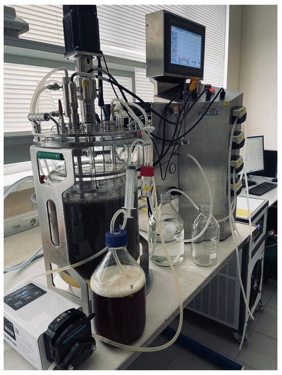 The experiment was performed in a laboratory bioreactor–fermenter equipped with a suite of analytical equipment. The main system, developed by Yocell Biotechnology, comprises a bioreactor vessel with a working volume of 11 L, constructed from borosilicate glass. The vessel is outfitted with a controllable electromechanical agitator with adjustable rotation speed, a pneumatic aeration system with adjustable aeration intensity, and a heating and cooling system via an external circuit. The bioreactor operated in a sequencing batch reactor (SBR) mode with a flow rate of 90 L per day. Figure 2 presents a photograph of the SBR used in the study.