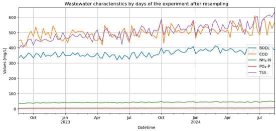 Figure 4 presents the concentration trends of the main contaminants in the influent wastewater (characteristics), shown after weekly resampling.