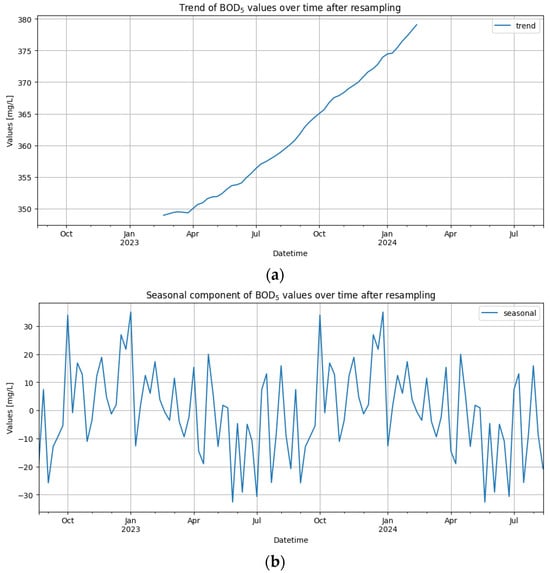 Characteristics of the timeline: (a) trend of BOD5 values over time after resampling; (b) seasonal component of BOD5 values over time after resampling.