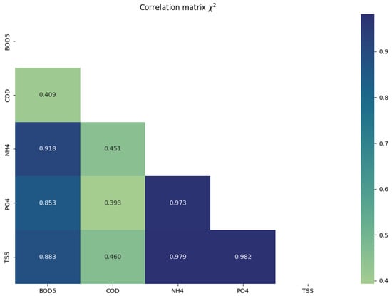The seasonal component is not pronounced, which is also associated with the absence of explicit seasonality in the preparation of synthetic wastewater. This study aimed to enable system operation under conditions lacking explicit seasonal dependencies, which are generally present in municipal wastewater to varying degrees. The strength of correlation between the target feature and measurable predictors was assessed using chi-squared values, as described in Section 2. The correlation matrix with calculated values is presented in Figure 6.