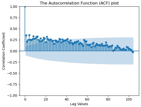 The correlation matrix reveals relationships between the target feature and other characteristics (ranging from 0.85 to 0.92) as well as among the predictors themselves. In this project, there is an understanding of the relationship between the concentrations of biogenic substances in the influent water and TSS due to the characteristics of synthetic wastewater preparation. The allowable multicollinearity threshold was set at 0.99; thus, predictor exclusion is not required. As specified in the task, the relationship between COD and BOD5 is minimal (0.4), which may be associated with the nature of wastewater formation. Additionally, to assess the correlation significance of time lags, an autocorrelation function (ACF) plot for the target feature time series was generated. The ACF plot is presented in Figure 7.