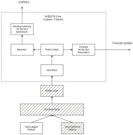 N-BEATS (Neural Basis Expansion Analysis for Interpretable Time Series Forecasting) is a state-of-the-art deep neural network specifically designed for time series forecasting. Introduced in 2020, the model has demonstrated outstanding results, outperforming many existing methods, including statistical models and other neural networks []. The model architecture consists of the Stack, Block, and Basis expansion layer components. Initially, N-BEATS was developed for univariate forecasting; however, its architecture can be adapted for multiple predictors through the following steps: