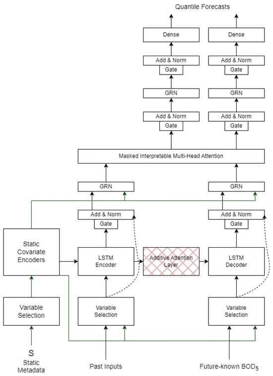 A distinctive aspect of our model is the incorporation of an additive attention mechanism between the encoder and decoder. This attention layer allows the decoder to selectively focus on relevant encoder time steps, enhancing the model’s ability to capture long-term dependencies and complex feature interactions. By combining the context vectors from attention with decoder outputs, the model effectively fuses historical and future information. To address the challenge of limited data, we employed extensive preprocessing, including scaling and careful sequence generation, ensuring the model effectively learns from the available observations. Training was conducted using the Adam optimizer and mean squared error loss function over 50 epochs, with early stopping based on validation performance to prevent overfitting. The scientific novelty lies in the tailored adaptation of the TFT model for wastewater quality prediction, specifically BOD5 forecasting, by integrating lagged features and multiple parameters within an attention-based sequence-to-sequence framework. This approach not only enhances predictive accuracy but also offers interpretability through the attention weights, potentially revealing critical periods and features influencing BOD5 levels. Such insights are invaluable for environmental monitoring and decision-making in wastewater management. Figure 9 presents a graphical representation of the TFT model architecture.
